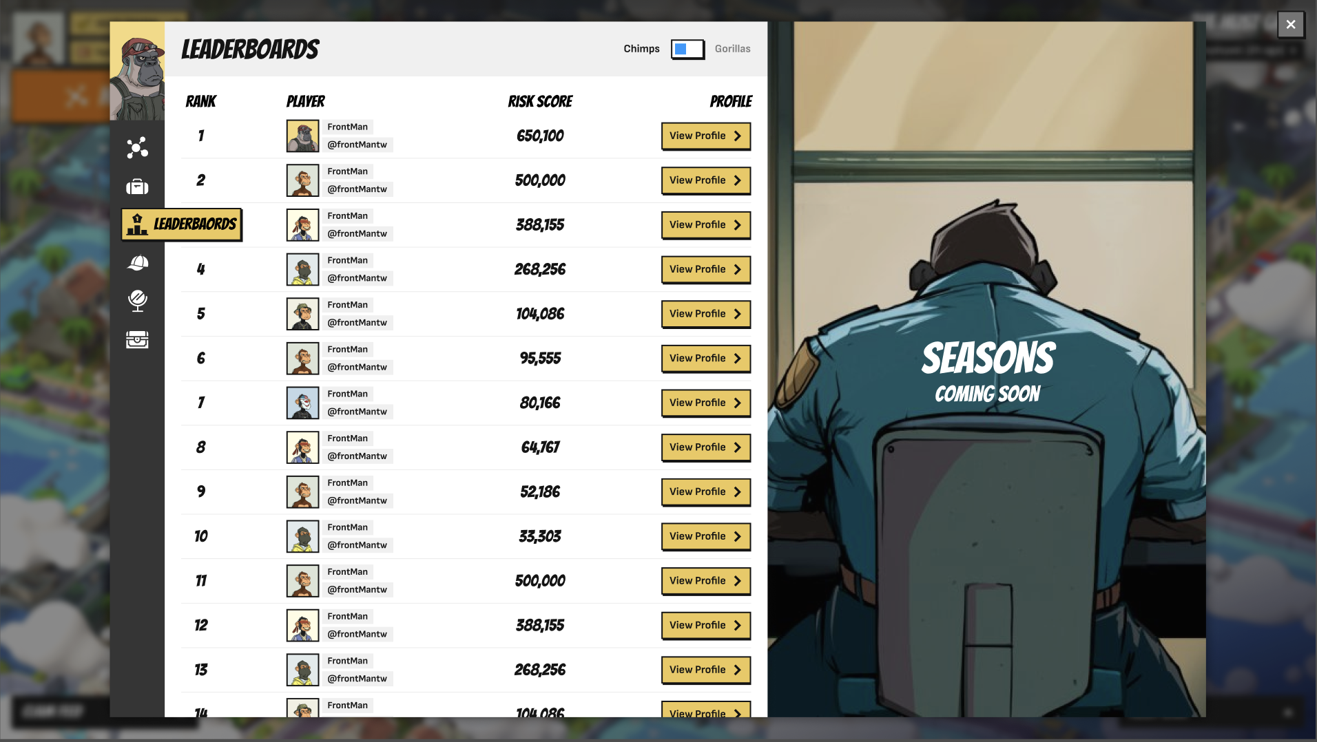 **Leaderboards** will be used to track and display various fields of high scores achieved by Chimps, Orangutans, and Gorillas within Peel City, rewarding high-ranking users.&#x20;