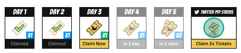 Users can claim a single ticket every 24 hours with a boost to 2 tickets on the 5th consecutive day they claim tickets. Users can claim extra tickets for having a Heist PFP on Twitter and linking their Twitter to their social profile.\